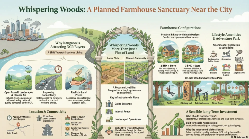 For buyers seriously exploring Naugaon farms, Whispering Woods represents a shift away from random plots toward a properly planned farmhouse lifestyle near NCR.